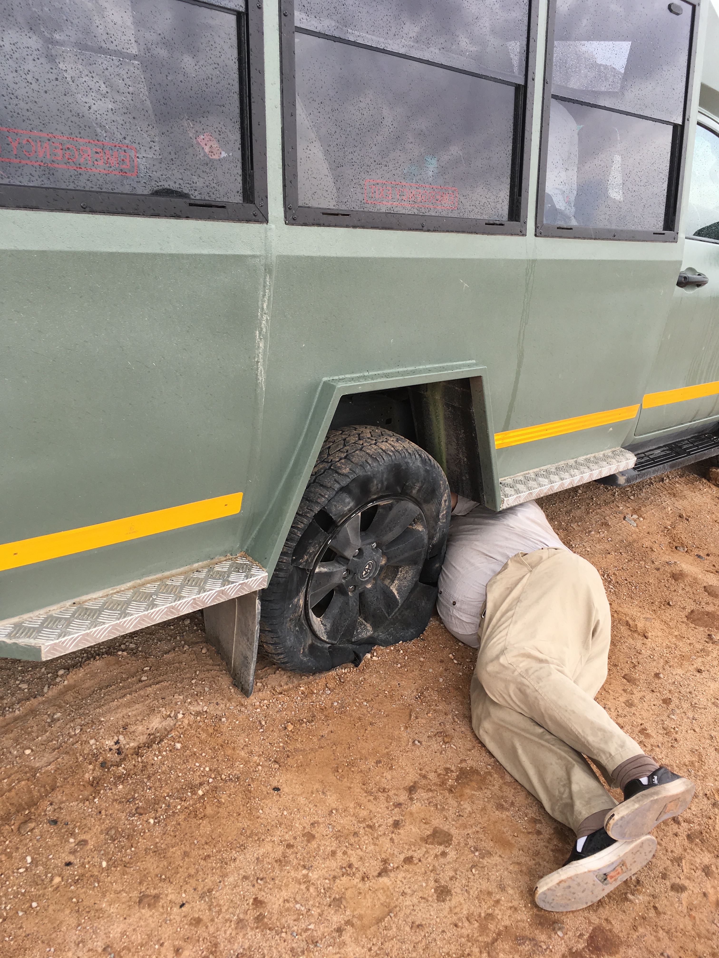 Just a couple of minutes later I was thinking by myself whilst I was looking out of the window: Why on earth are there some black stones or grains flying around whilst everything is are white or grey stones??? …. Before that thought could really sink in I could smell it and our driver already stopped! We also had a flat tire. The one underneeth me ….