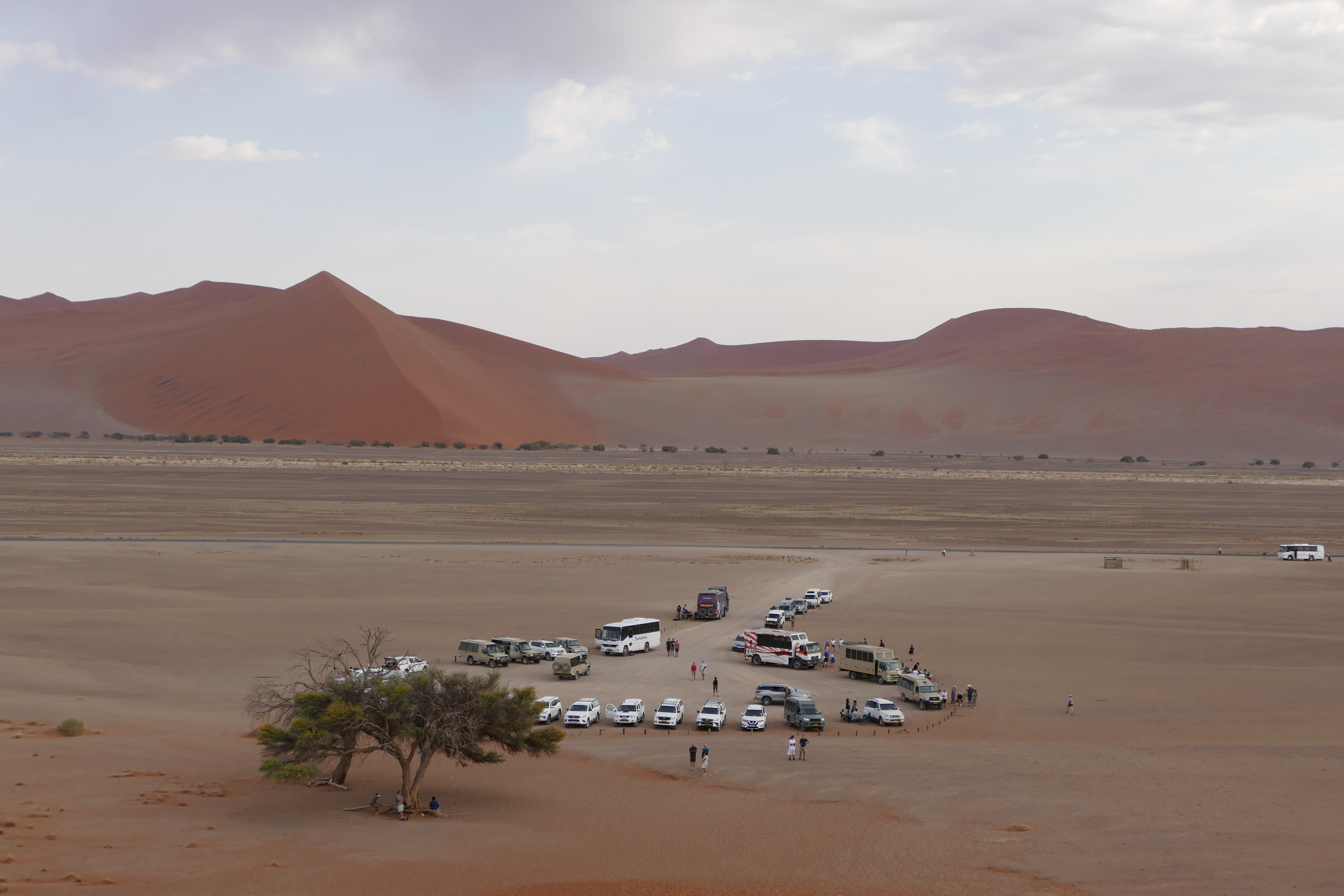 After a good night sleep we started at 6.30am to get to Sossusvlei. By the way one little tipp: Unless you are staying in a Lodge nearly in or at Sossuvlei park there is no point in trying to get there before sunrise! They only open the entrance at sunrise and let the cars slowly get into the park. So unless you are the first car in the line you will anyway not see the sun coming up behind the dunes. Much better to be there a little later as also you are then not driving in the dust of all the others cars in front or behind you trying to be first at the entrance. Any ou can take a picture like this: