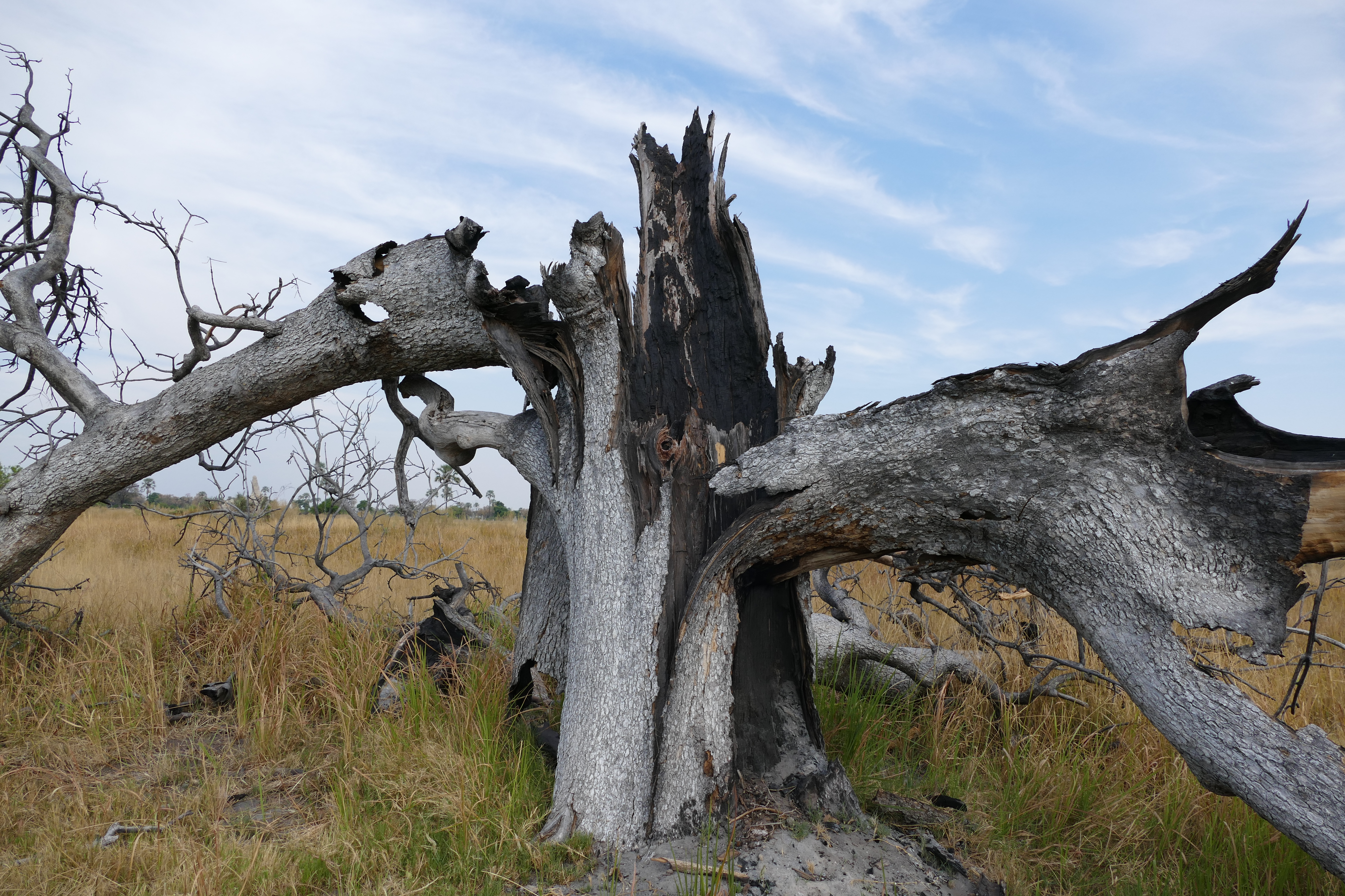 At 6am we got awakened again for our last tour. Half of our group didnt want to come, Rita had seen the elephant already at 1am and hadn´t slept at all, Ann was also a bit nervous however wanted to go on the walk. We started with our guides whom already had heard about the elephant at the camp. They knew that he was still there so we had to take an extra long walk to get to the Mokoros. However when we had walked around him he saw us and started walking towards us. I was second in the line right after our main guide and stopped walking when the elephant was nearly only 2-3m away from me, Ann behind my realised what was going on and got panic and was scared. She started running and stumbled. I tried to calm her down as they guides indicated to us that we need to keep going – slowly … so Ann took my hand and the guys were also a bit stressed. Finally we made it to the boats and got all in. When we arrived at the other side we thought we would be safe and could breeze a bit – to early too happy! There was – even worse – an elephants family with a baby!! So we had to turn three times till we got out of their way! Not enough …. as soon as we started walking through the grass our guide got the message via walky talky that a buffalo was running behind us! So he speeded up and we were also literally running in the heat for 30 minutes till we saw the buffalo on the other side reunited with his herd again. Fully exhausted we made it to the goal of our walk – the elephants graveyard, a place where all elephants are going when they sense that they would die soon.