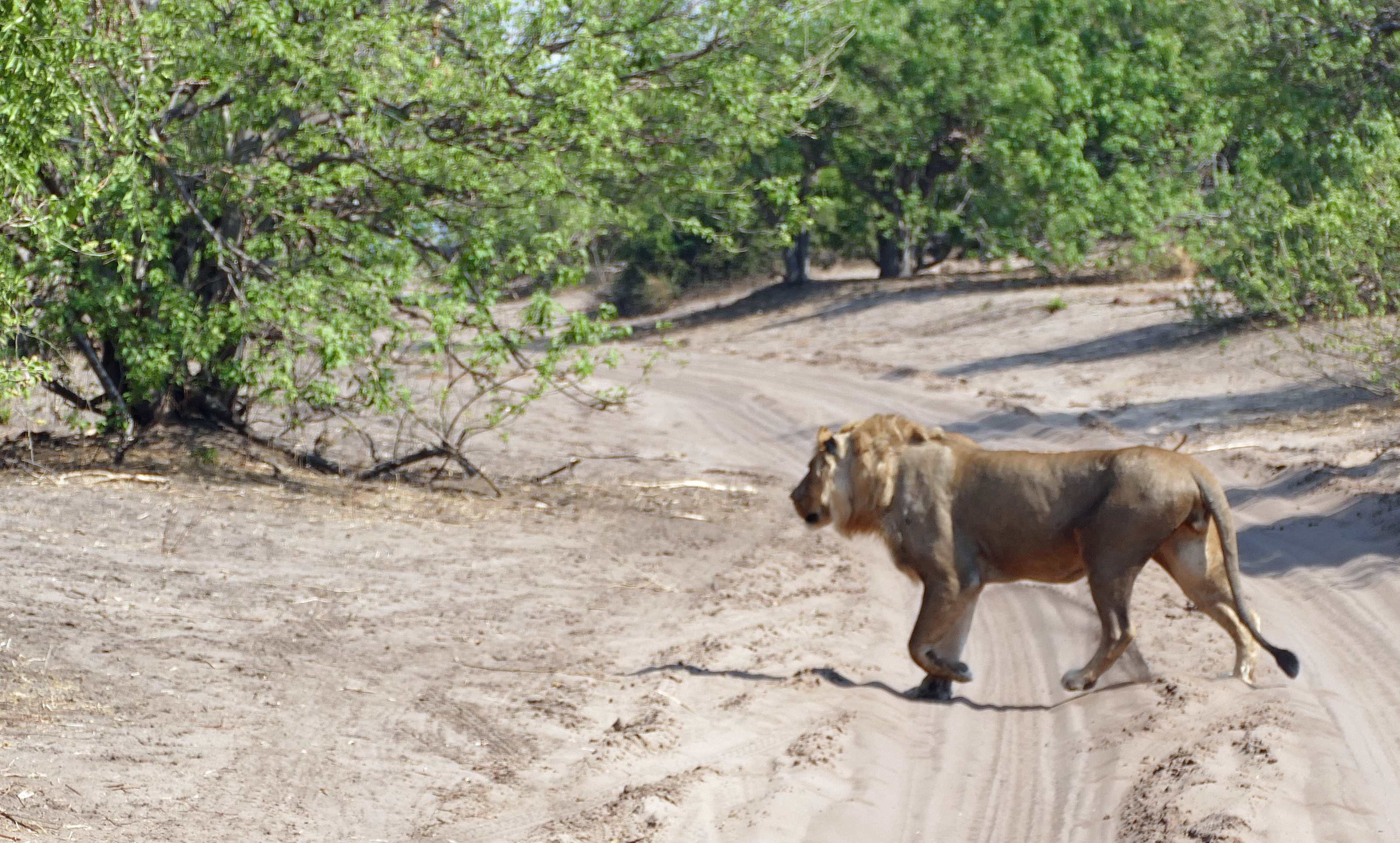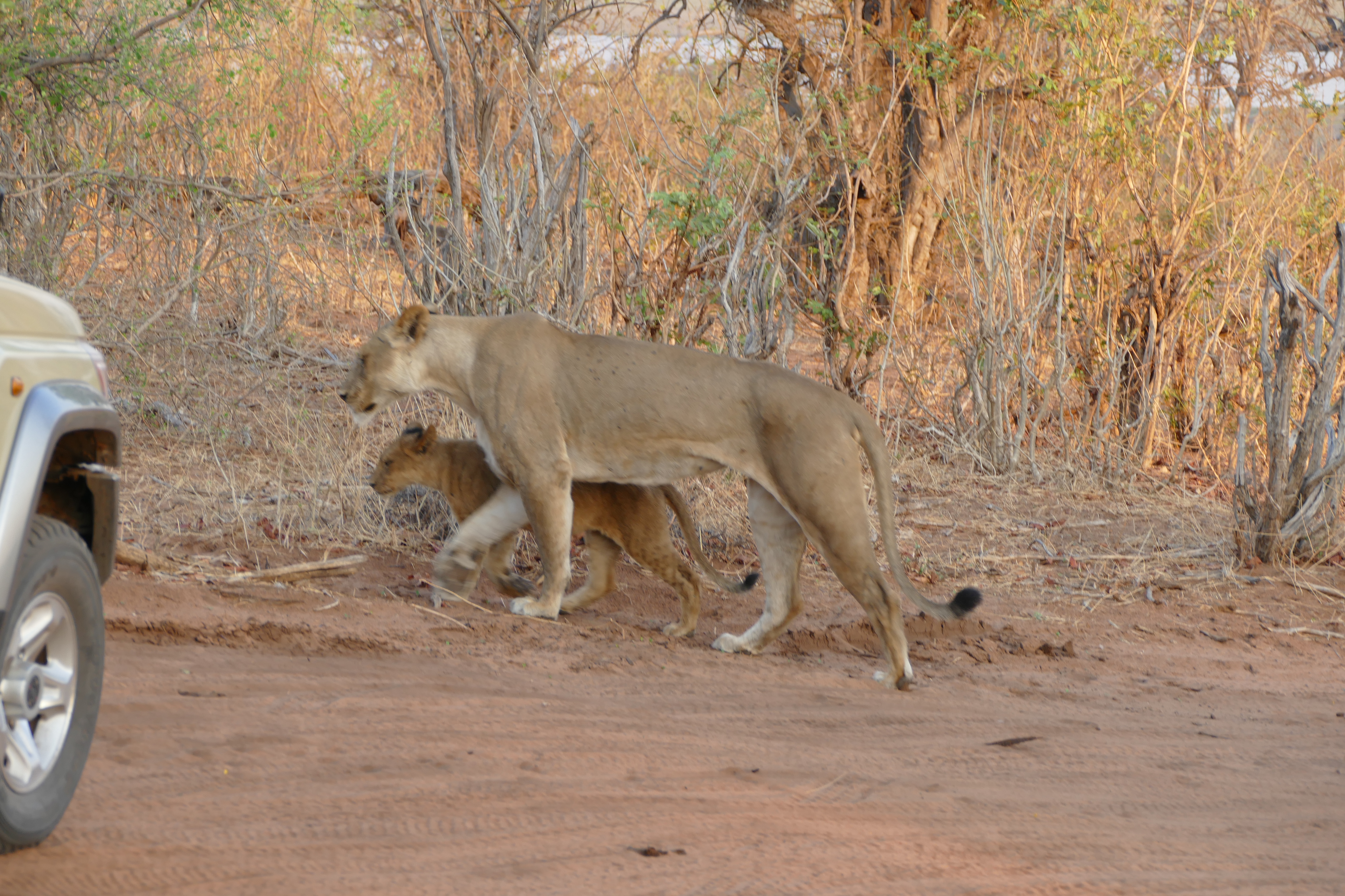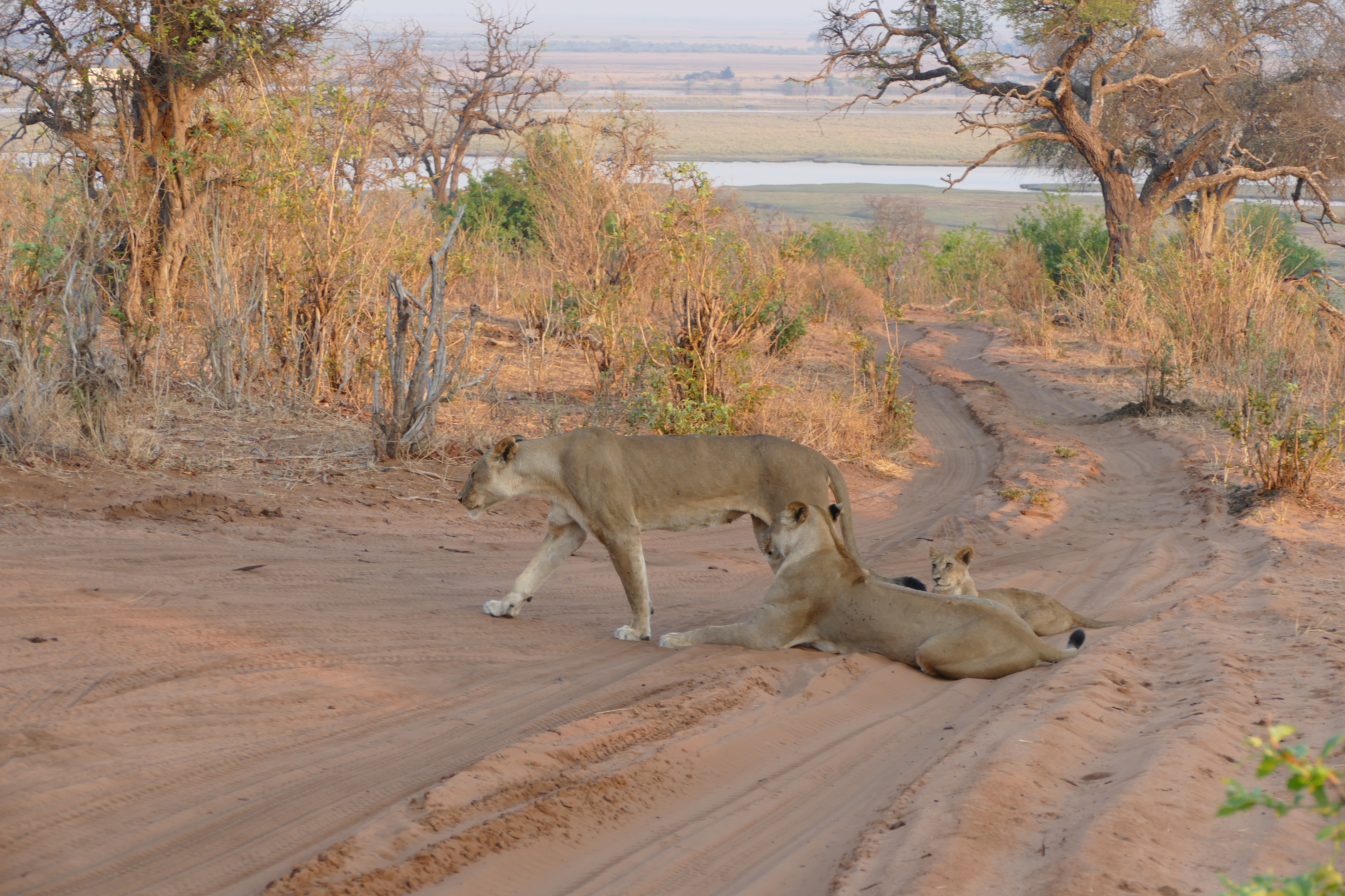 When we arrived back at the Lodge we realized that at this Lodge you had to be either super early and to take all the food you want to eat from the buffet in one go or you will not get anything to eat 🙂 So some lessons learnt for breakfast next morning. We started at 5.30am for our game drive through the Chobe Nationalpark. I was sitting right behind the driver of the Safari Jeep and made kind of a joke saying that I really would love to see male lions and leopards this morning as that might be the last opportunity. So after he paid the entrance fee he turned left more deeper into the nationalpark rather then following the other Jeeps to the right going done to the coast line. And guess what – I nearly couldnt believe it!! After a couple of kilometers we saw a lion family lieing in front of us in the sand – the male lion hiding in the bushes!! So amazing …..