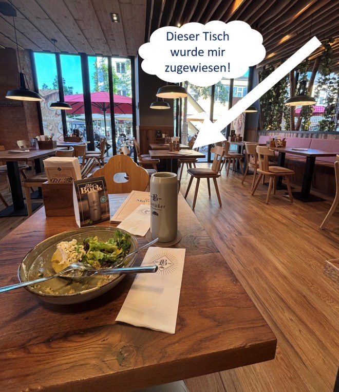 Ganz anders das Brauhaus: Beim ersten Mal wurde ich mit offenen Armen empfangen, direkt ans Fenster gesetzt – quasi mit Aussicht aufs Glück. Leckeres Bier, saisonale Küche, und das Gefühl, willkommen zu sein. Doch auch da schlug das Gastro-Karma irgendwann zu: Plötzlich war ich nur noch das stille Deko-Element mitten im Raum. Die Auswahl zwischen „Präsentierteller“ oder „Katzentisch“ war nicht gerade berauschend. Ich nahm den mit Bank – immerhin. Aber: Während meines gesamten Aufenthalts blieb der Rest der Restaurantecke … leer! Gut zu erkennen in meinem Beitragsfoto.